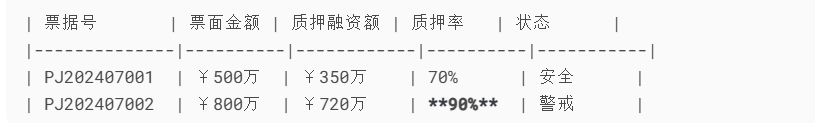 • 票据池动态质押率监控(警戒线≥130%)